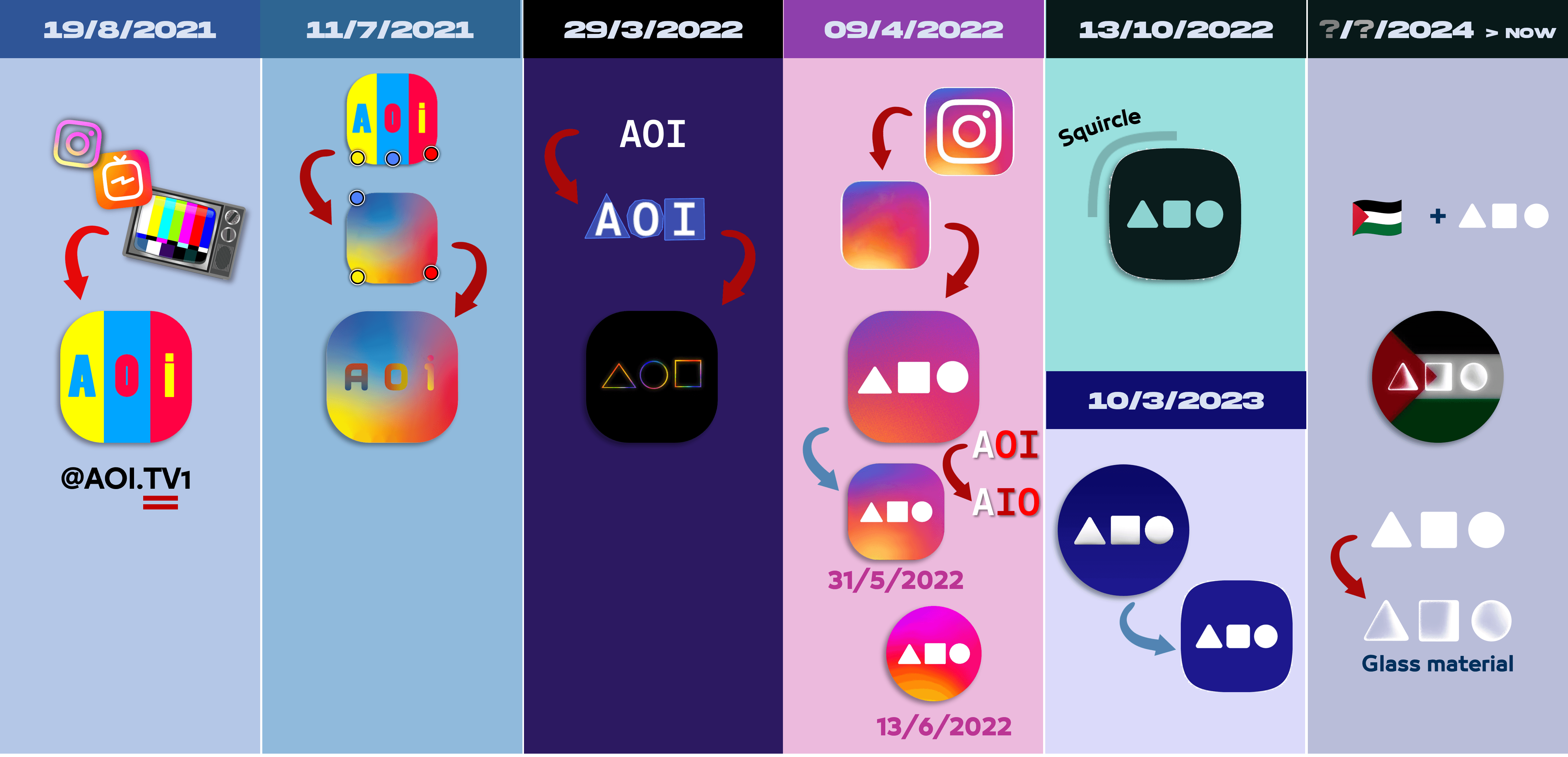 تطور شعار AOI (أو AIO) عبر الزمن، ابتداءً من 19 أغسطس 2021 وحتى الوقت الحاضر. هنا وصف و تقرير حول هذا الشعار حسب الصورة أعلاه: