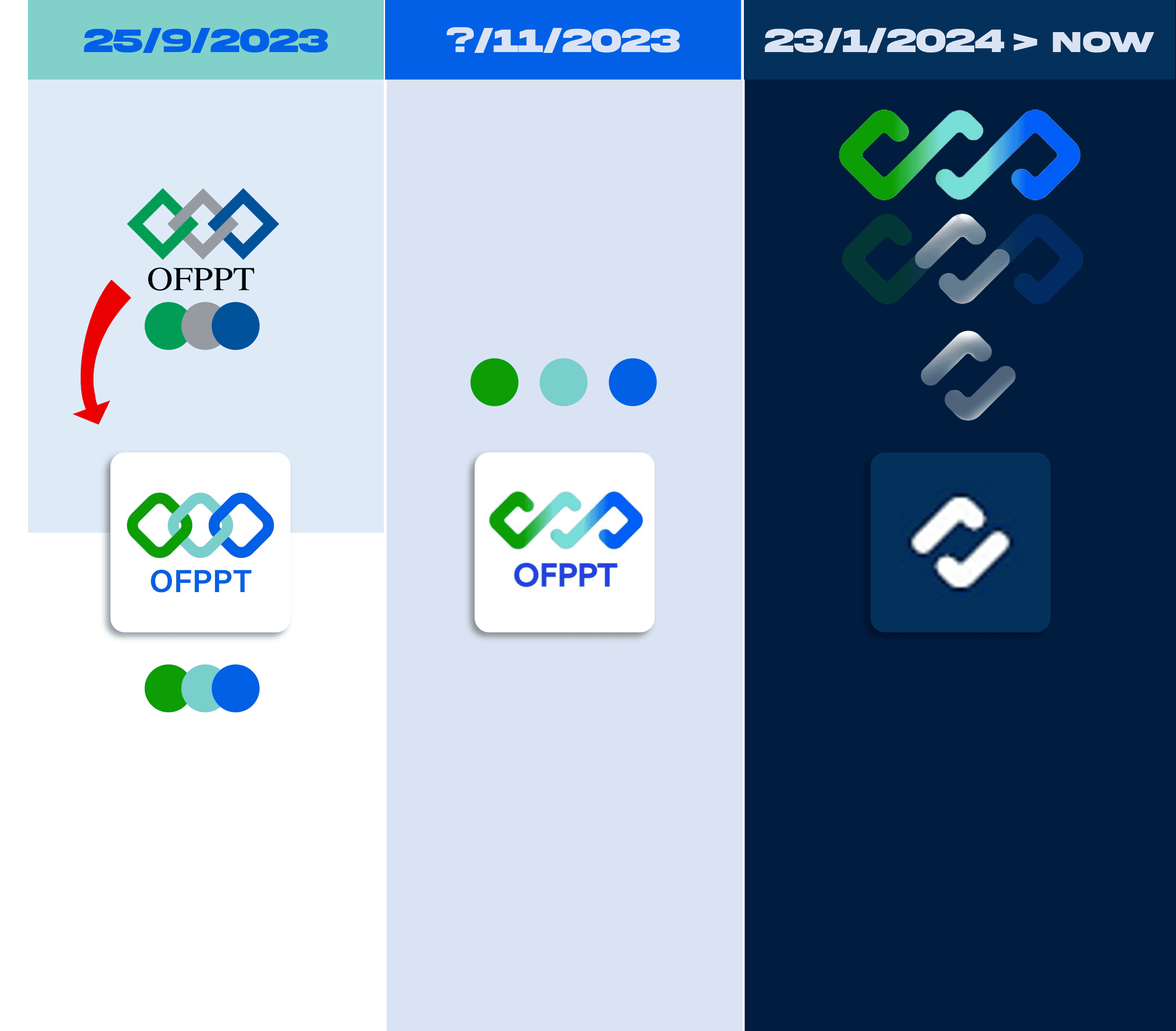 التحسينات: الشعار أصبح أكثر بساطة وحداثة، مع إزالة النص "OFPPT" لتركز العناصر البصرية على الرمز فقط، مما يسهل تمييز الشعار.